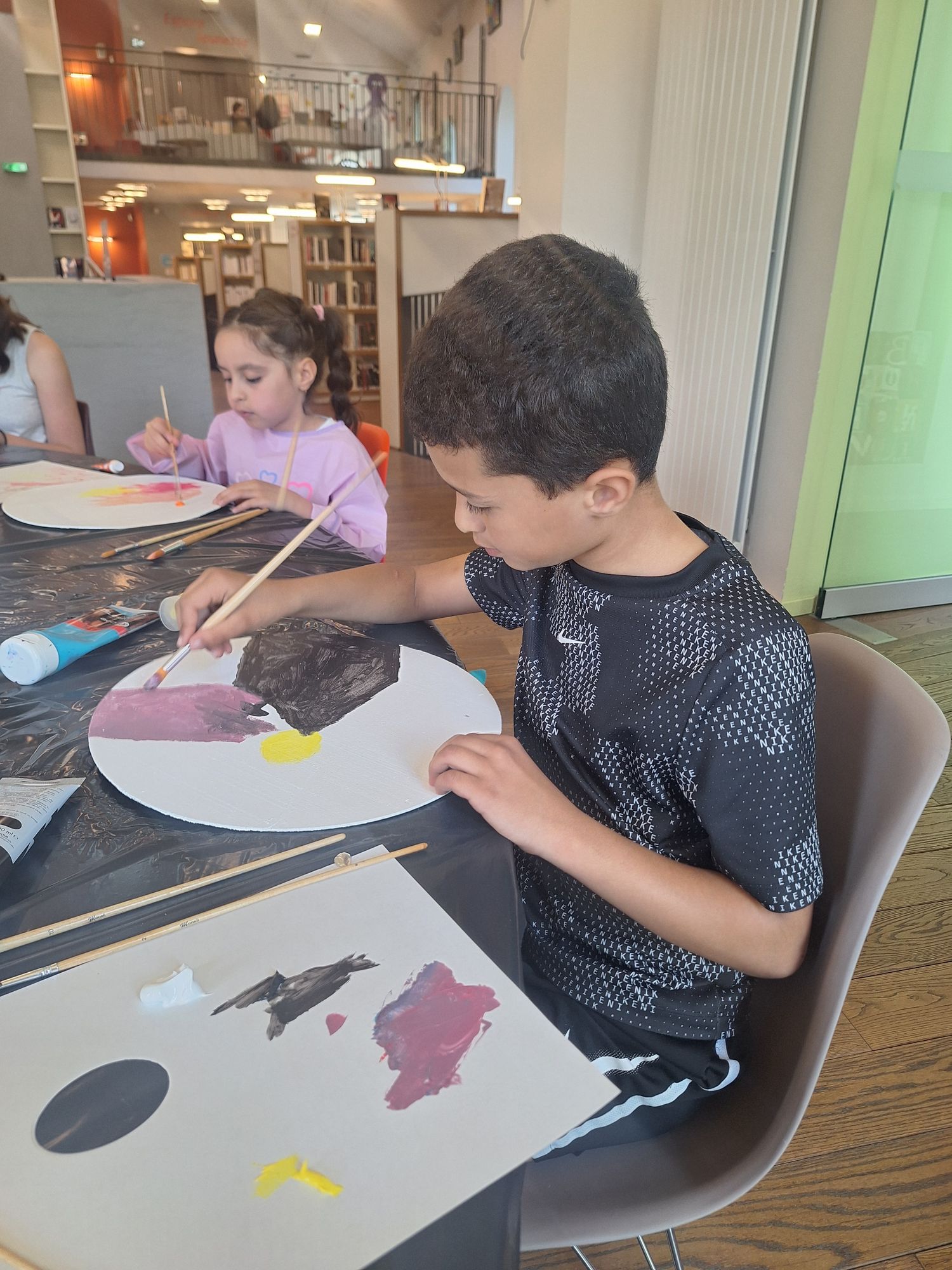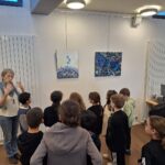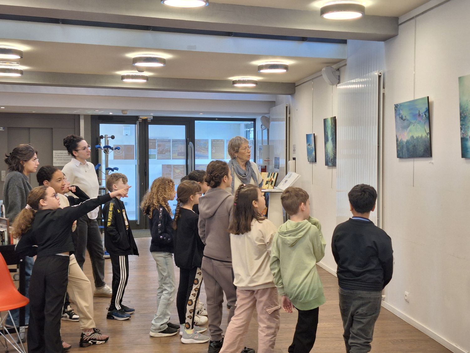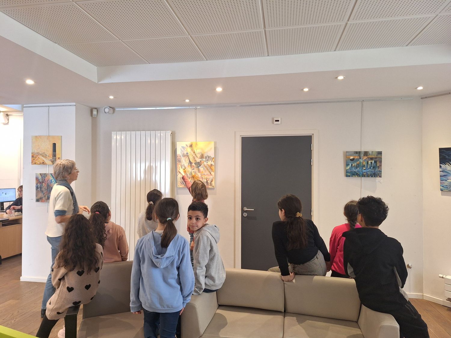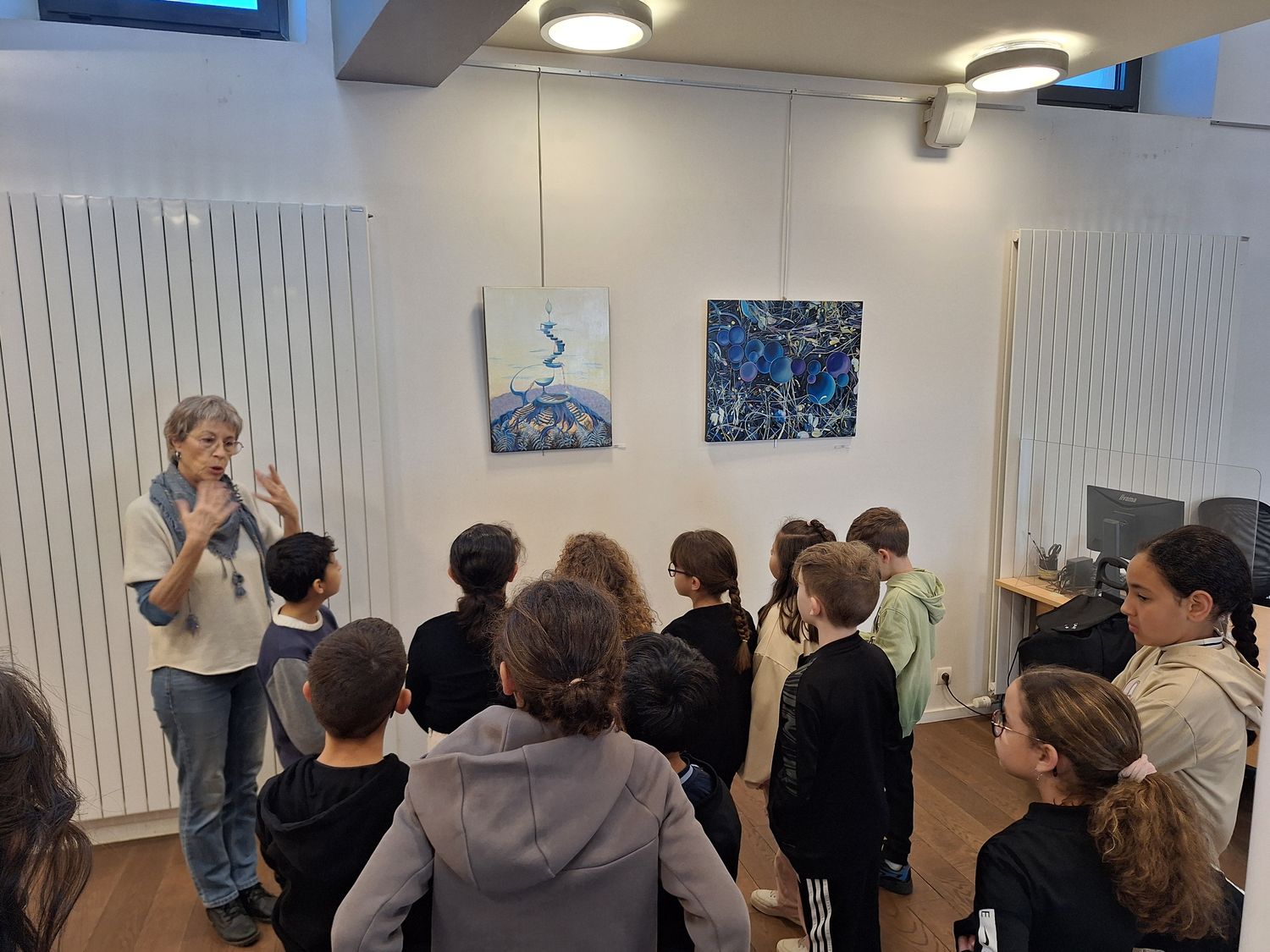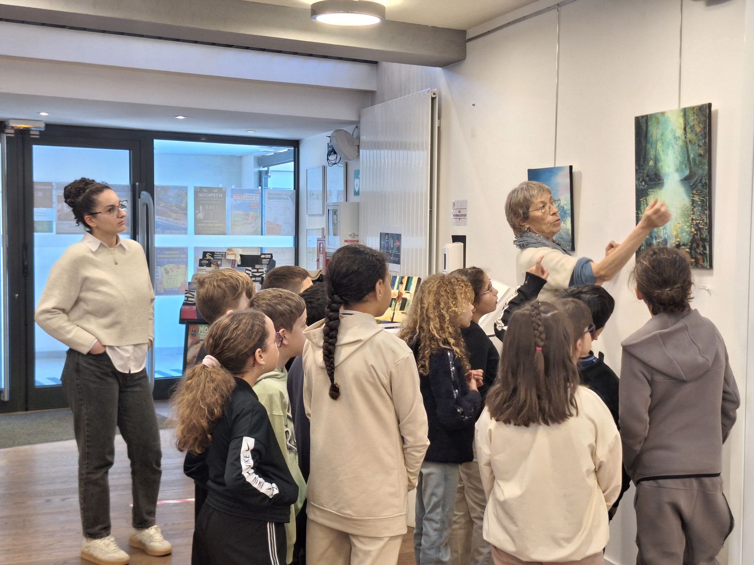 Dans le prolongement de son exposition « Éclats d’azur » à la médiathèque, Brigitte Pinel a proposé plusieurs temps d’échanges avec le public. Elle a d’abord accueilli la classe de CE2-CM1 de Manelle Benkhelifa, enseignante à l’école Pilâtre de Rozier, pour une découverte de son univers. Les élèves, très curieux, ont multiplié les questions : « Combien de temps faut-il pour réaliser une œuvre ? », « D’où vient l’inspiration ? », « Peut-on vivre de son art ? ». Autant de sujets qui ont nourri un dialogue spontané, mêlant réflexion et partage autour du processus de création. Brigitte Pinel a également animé un atelier de peinture ouvert à tous. Les participants ont pu y expérimenter les techniques de l’artiste. Guidés pas à pas, ils ont exploré les jeux de couleurs, de textures et de compositions qui caractérisent son travail.