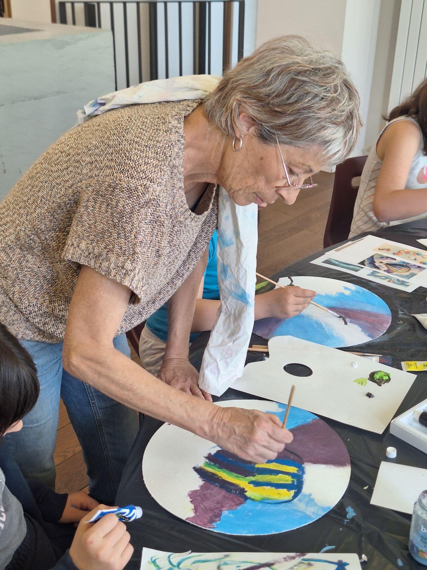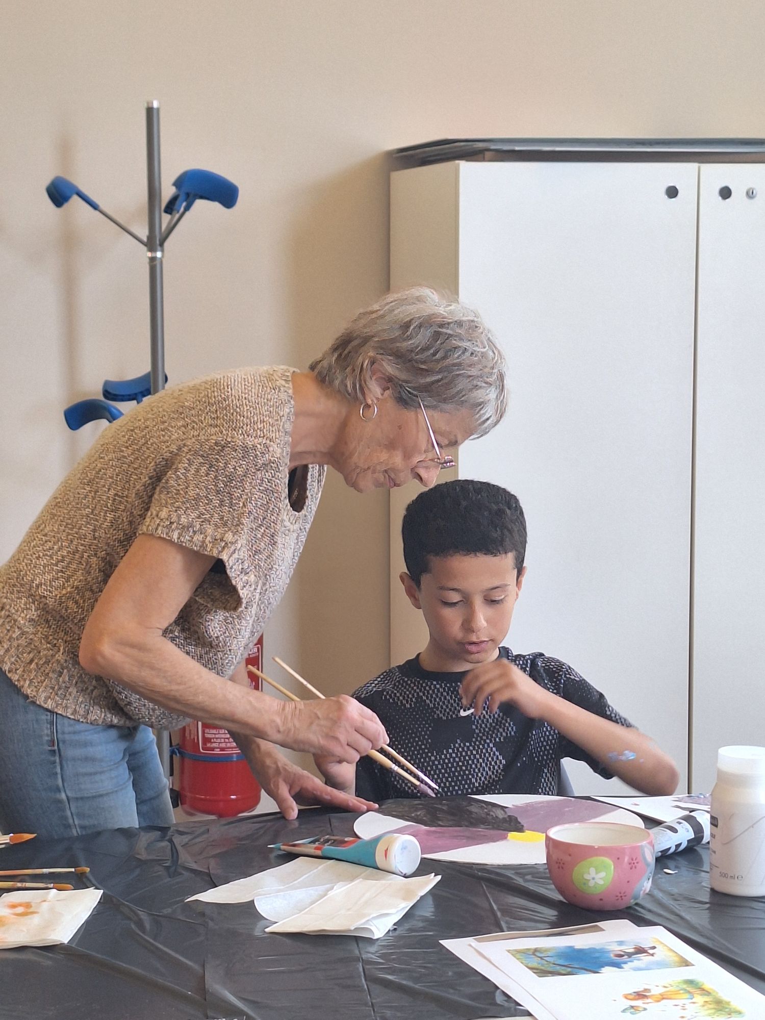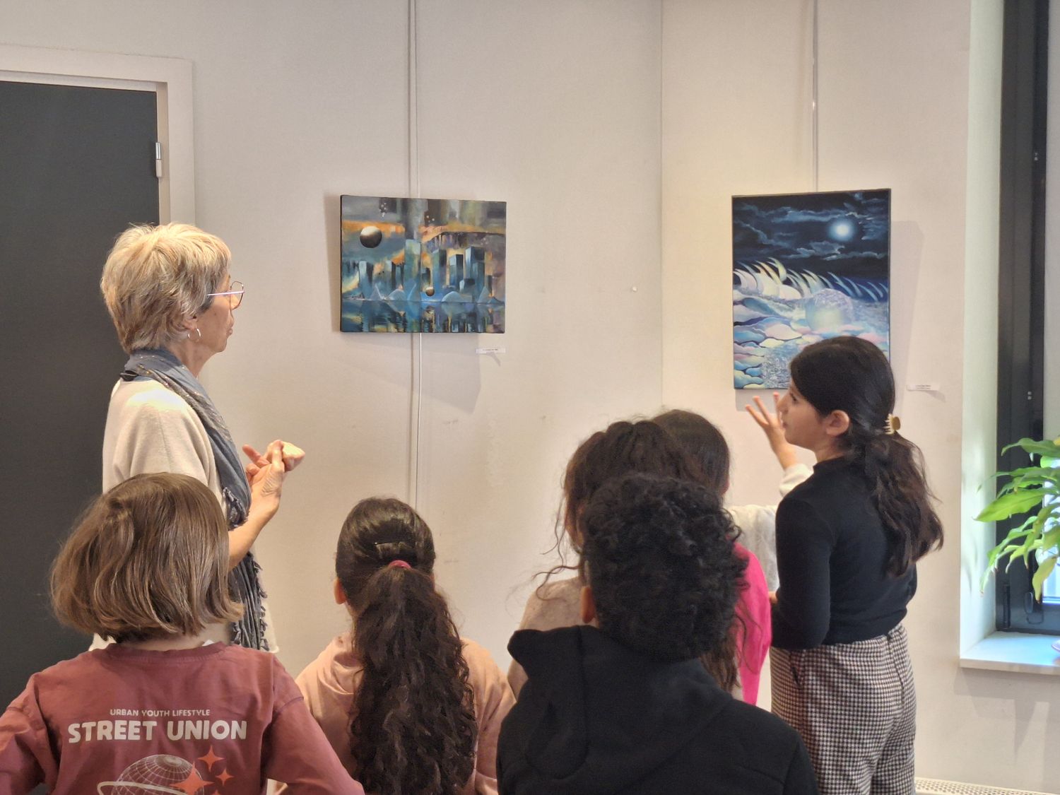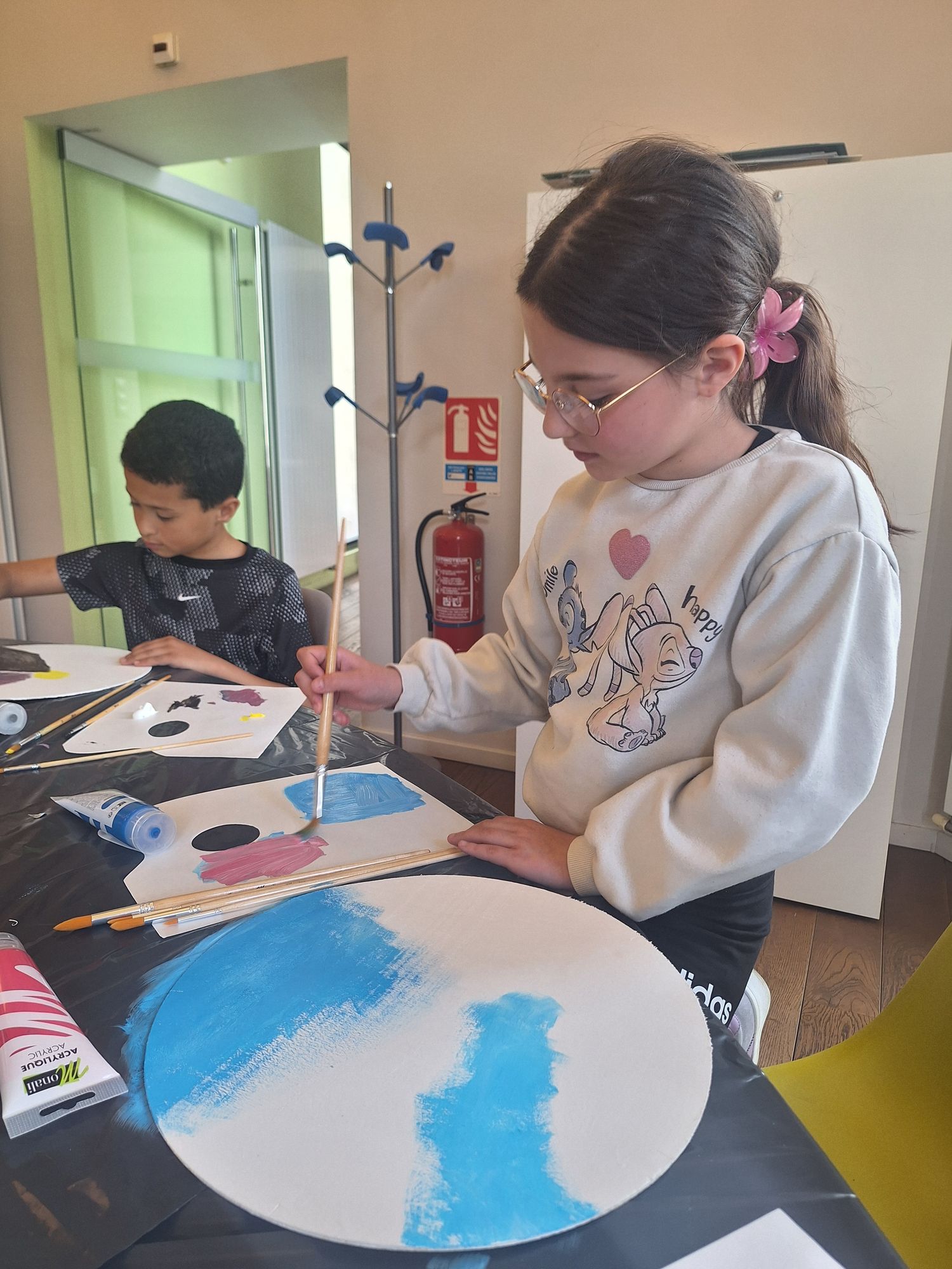 Dans le prolongement de son exposition « Éclats d’azur » à la médiathèque, Brigitte Pinel a proposé plusieurs temps d’échanges avec le public. Elle a d’abord accueilli la classe de CE2-CM1 de Manelle Benkhelifa, enseignante à l’école Pilâtre de Rozier, pour une découverte de son univers. Les élèves, très curieux, ont multiplié les questions : « Combien de temps faut-il pour réaliser une œuvre ? », « D’où vient l’inspiration ? », « Peut-on vivre de son art ? ». Autant de sujets qui ont nourri un dialogue spontané, mêlant réflexion et partage autour du processus de création. Brigitte Pinel a également animé un atelier de peinture ouvert à tous. Les participants ont pu y expérimenter les techniques de l’artiste. Guidés pas à pas, ils ont exploré les jeux de couleurs, de textures et de compositions qui caractérisent son travail.