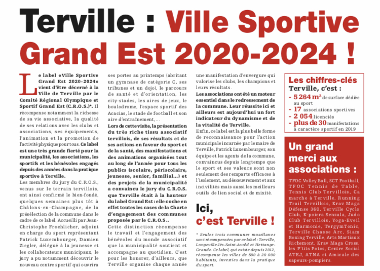 Le label « Ville Sportive Grand Est 2020-2024 » vient d’être décerné à la Ville de Terville par le Comité Régional Olympique et Sportif Grand Est (C.R.O.S.)*. Il récompense notamment la richesse de sa vie associative, la qualité de ses relations avec les clubs et associations, ses équipements, l’animation et la promotion de l’activité physique pour tous. Ce label est une très grande fierté pour la municipalité, les associations, les sportifs et les bénévoles engagés depuis des années dans la pratique sportive à Terville.