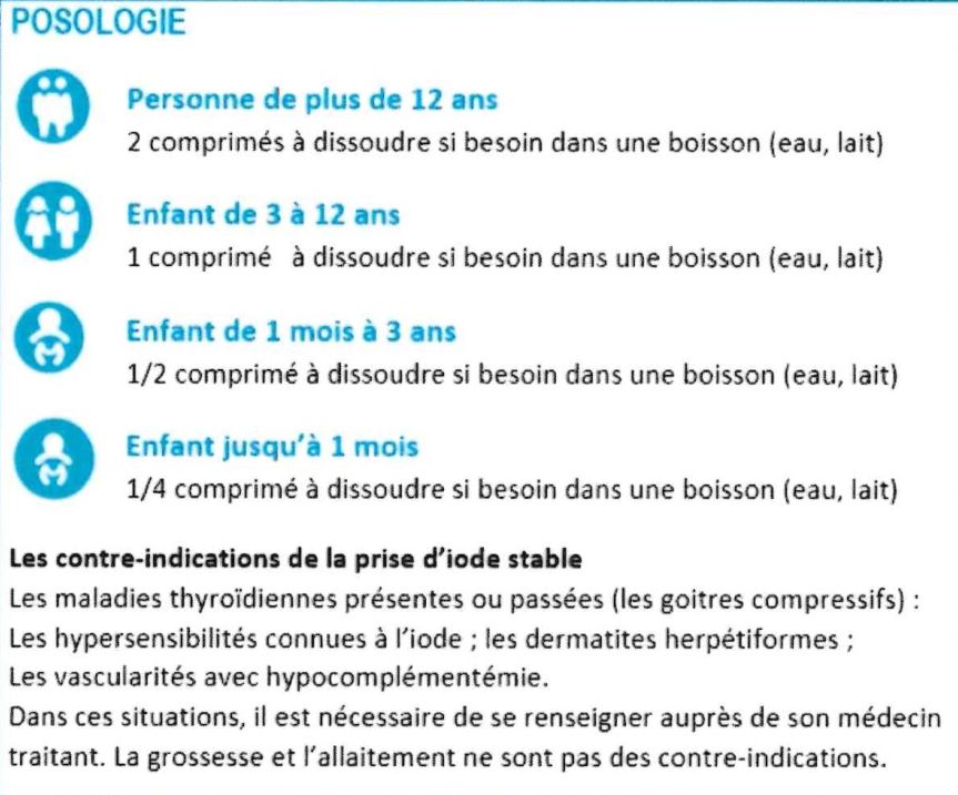 La dose d’iode stable doit être prise uniquement et immédiatement à la demande du préfet (suivez la posologie).